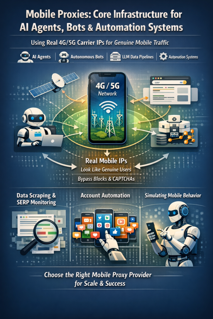 Mobile proxies have become core infrastructure for AI agents, autonomous bots, LLM data pipelines, and advanced automation systems. Unlike datacenter proxies, mobile proxies use real 4G/5G carrier IP addresses, making traffic appear as genuine mobile users — dramatically reducing blocks, CAPTCHAs, and anti-bot detection.